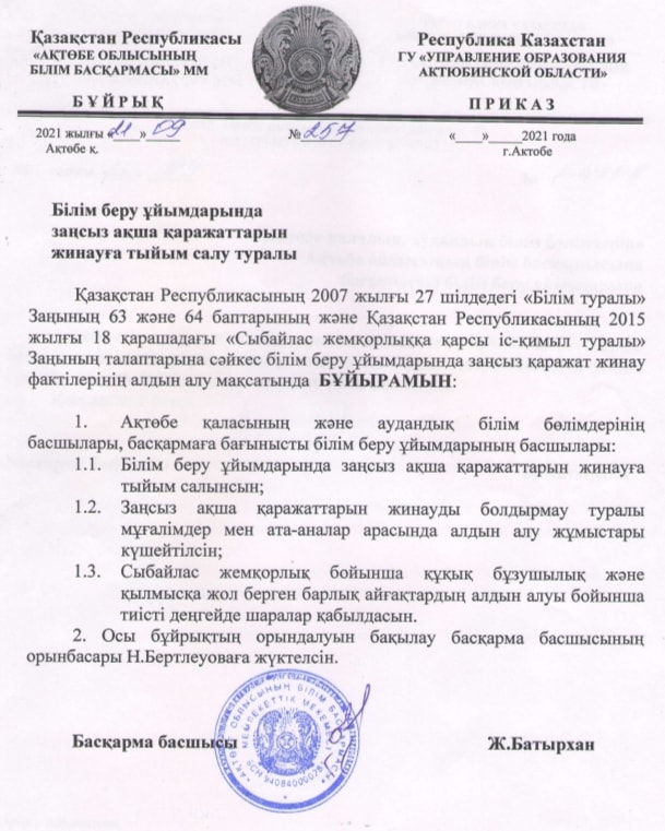 | 5 | Білім беру ұйымдарында заңсыз ақша қаражаттарын жинауға тыйым салу туралы бұйрық | |